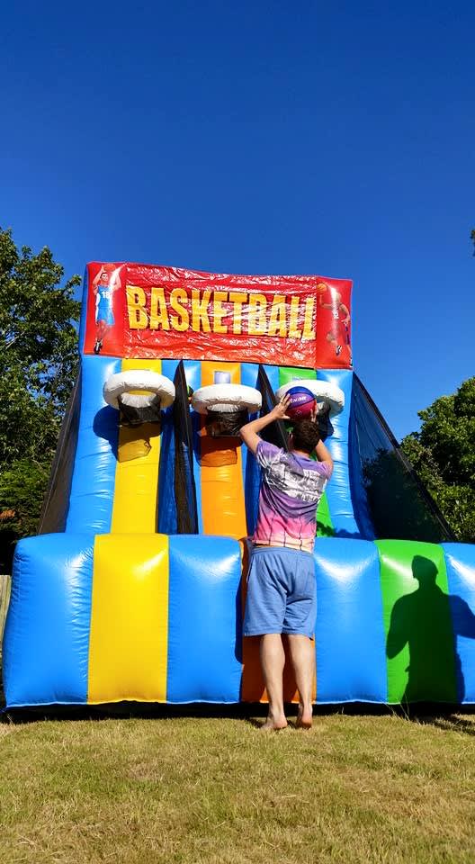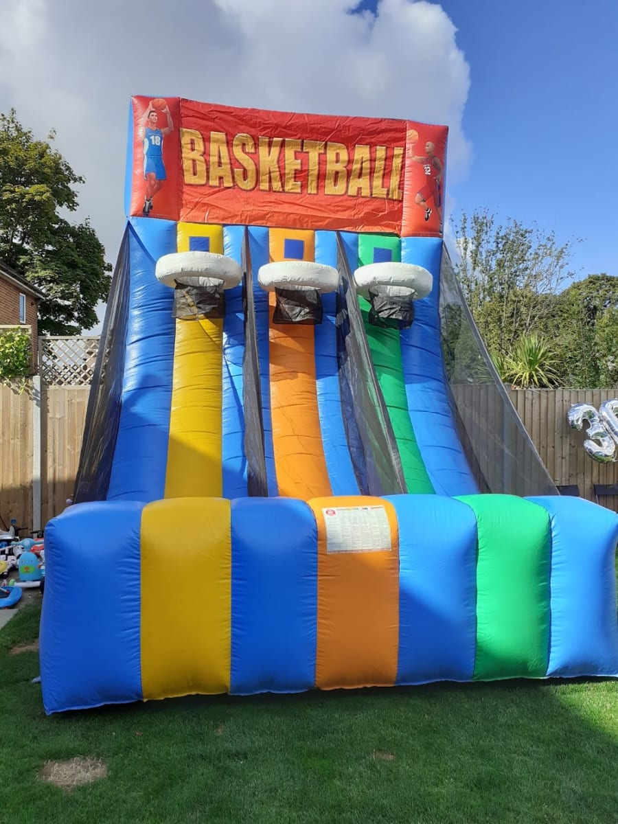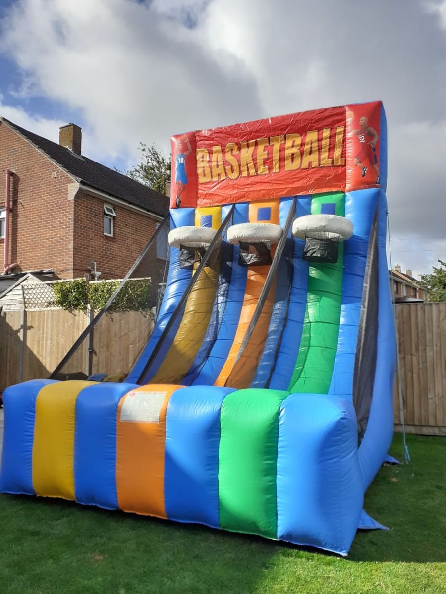 Basketball Shoot Out Great for birthday parties and also brilliant money makers at Events and School Fetes. Bright and colourful artwork, it stands very tall and looks very impressive, nearly 16 feet tall! You don't have to be a brilliant basketball player for this game, its still great fun. Supplied with basketballs, delivery, set up and collection included.