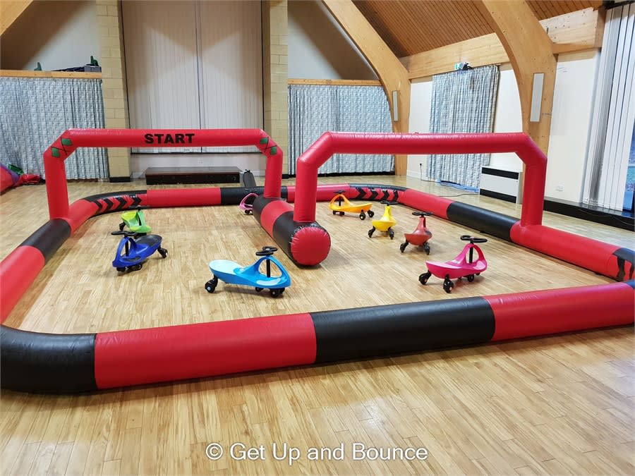 A full race set up 22ft (6.6mm) x 19 ft (5.8m) (At least 7.2m x 6.0m space required) which includes the inflatable race track, 8 x racing wiggle cars. You just sit on them, wiggle the steering left to right and away you go. They drive themselves. Race on !!!