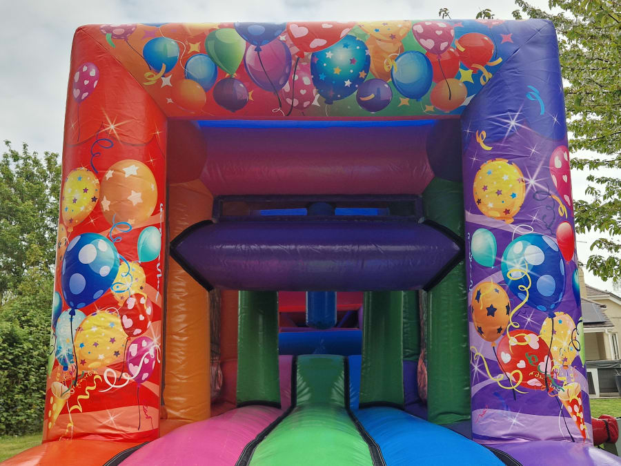 Our big Assault Course provides everything for an exhilarating bpunce experience. Jump through the entrance holes at the front, knock over & through the biff and bash, bounce, climb the blocks and end in an exciting big slippy slide. Suitable for children aged 3 to 16 years. Please Note we require a minimum of 85cm width clearance through all walkways and pathways to the set up area.