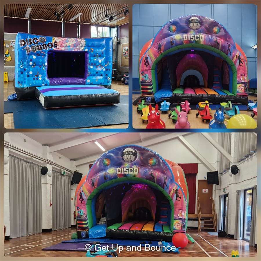 The Music and disco lights play within each inflatable. Turn your hire venue into a Bouncy Castle Play Disco Night Club. Perfect for birthday parties, events and celebrations as it offers all round entertainment. We offer this package to hire throughout Poole, Bournemouth, Christchurch, Wimborne, Ringwood, Blandford and across Dorset.