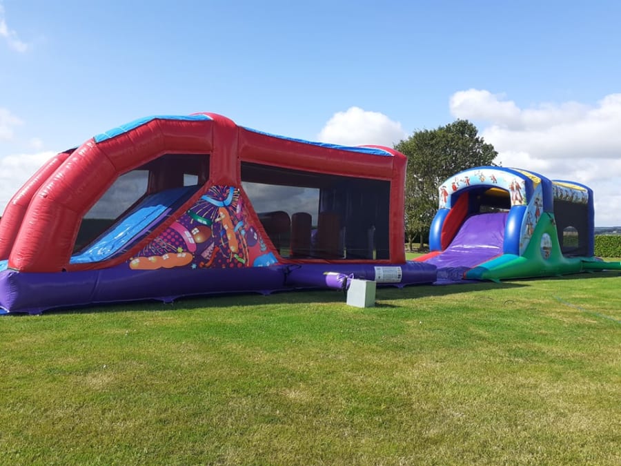 This is both of our 30 foot Assault Courses (Multicolour Theme and Celebration Theme) In Line to Create a Mega Assault Course