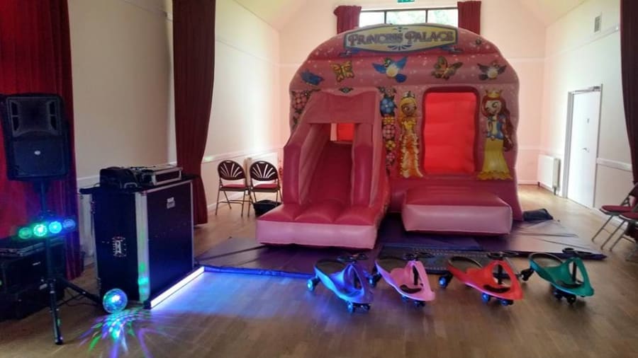 Hall Space required depends on castle selected. Approx. 6 x 6 FT (2m x 2m) for the Disco Equipment. Plus 23 ft x 15ft for the Bouncy Castle.